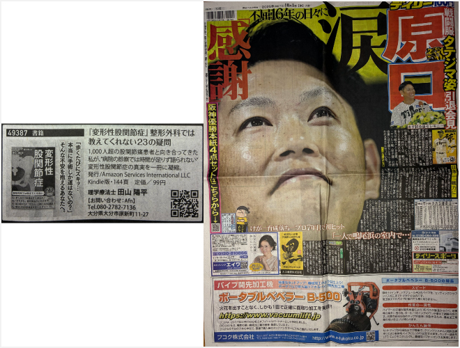 デイリースポーツの広告に「変形性股関節症 整形外科では教えてくれない23の疑問」が紹介されました。